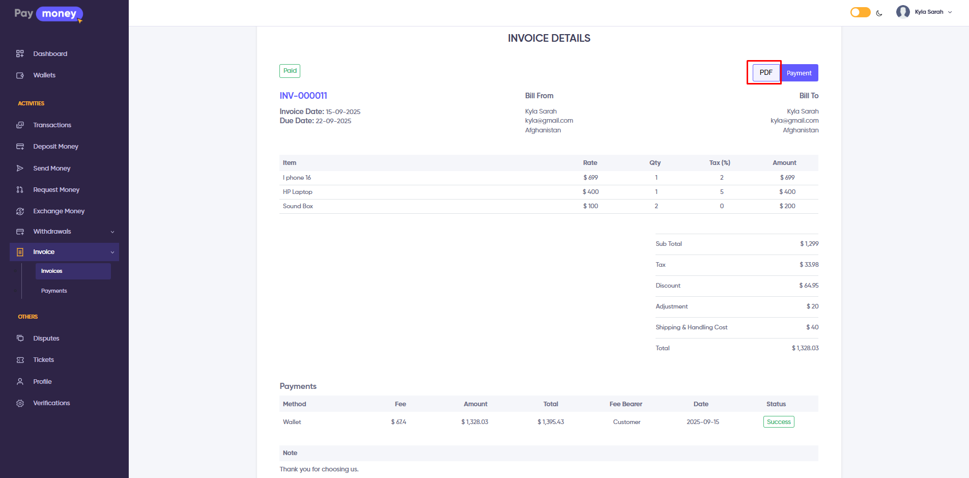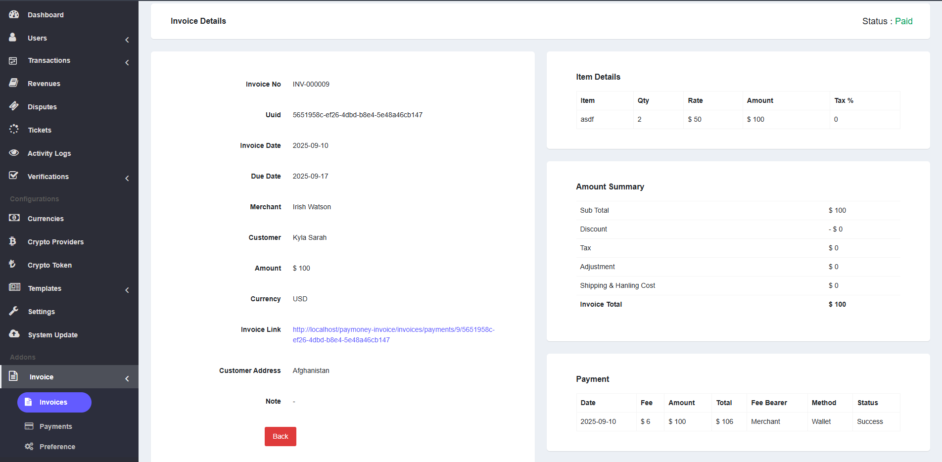 - Invoice Link – Merchants can copy and share the invoice URL.
