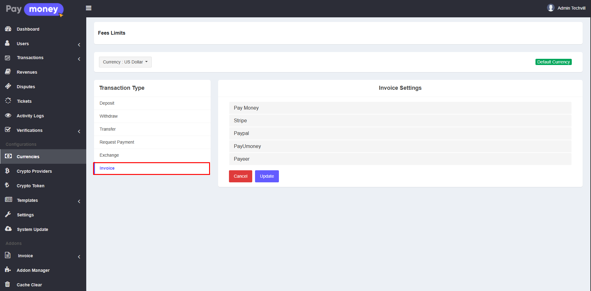 Admins can configure transaction fees and define limits for invoice payments. This ensures flexibility in managing charges and maintaining control over payment thresholds.