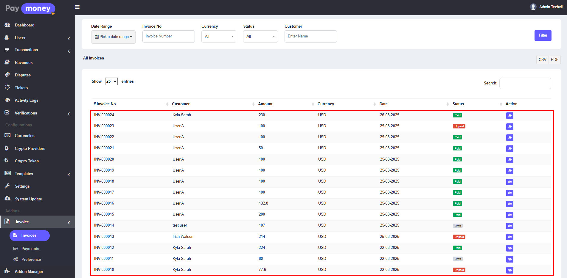 Admins can view a complete list of all invoices under Invoice > Invoices.