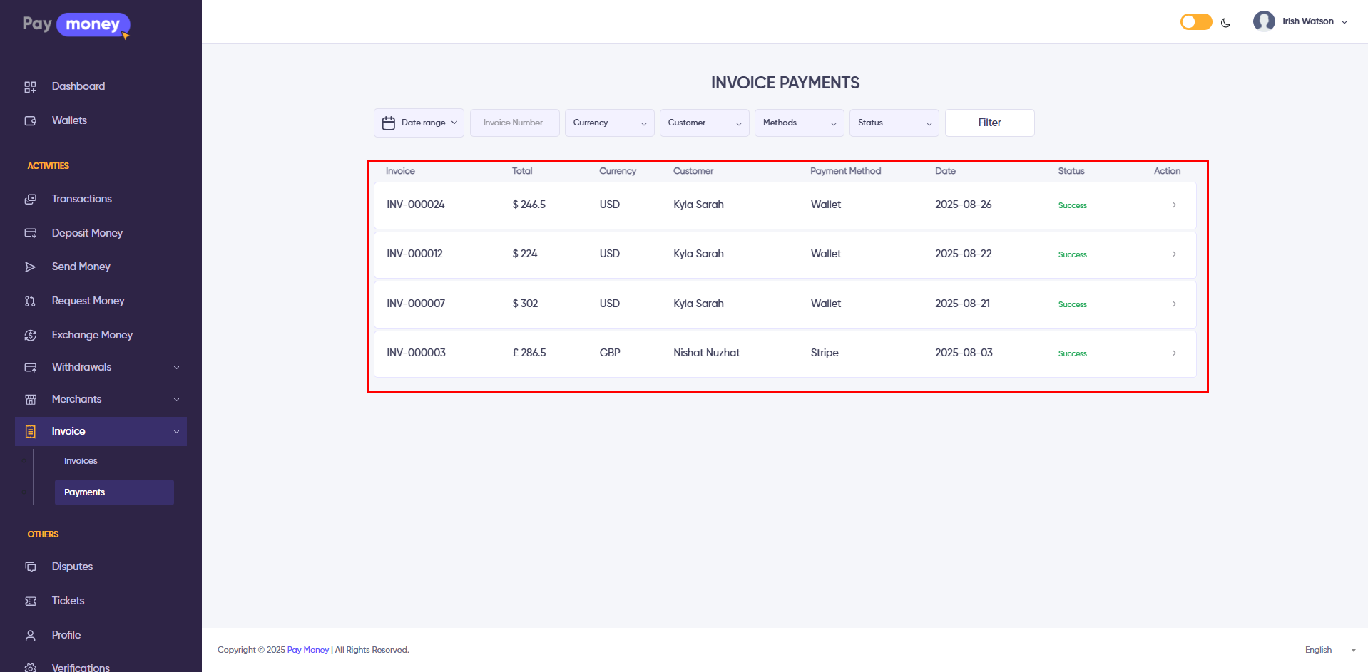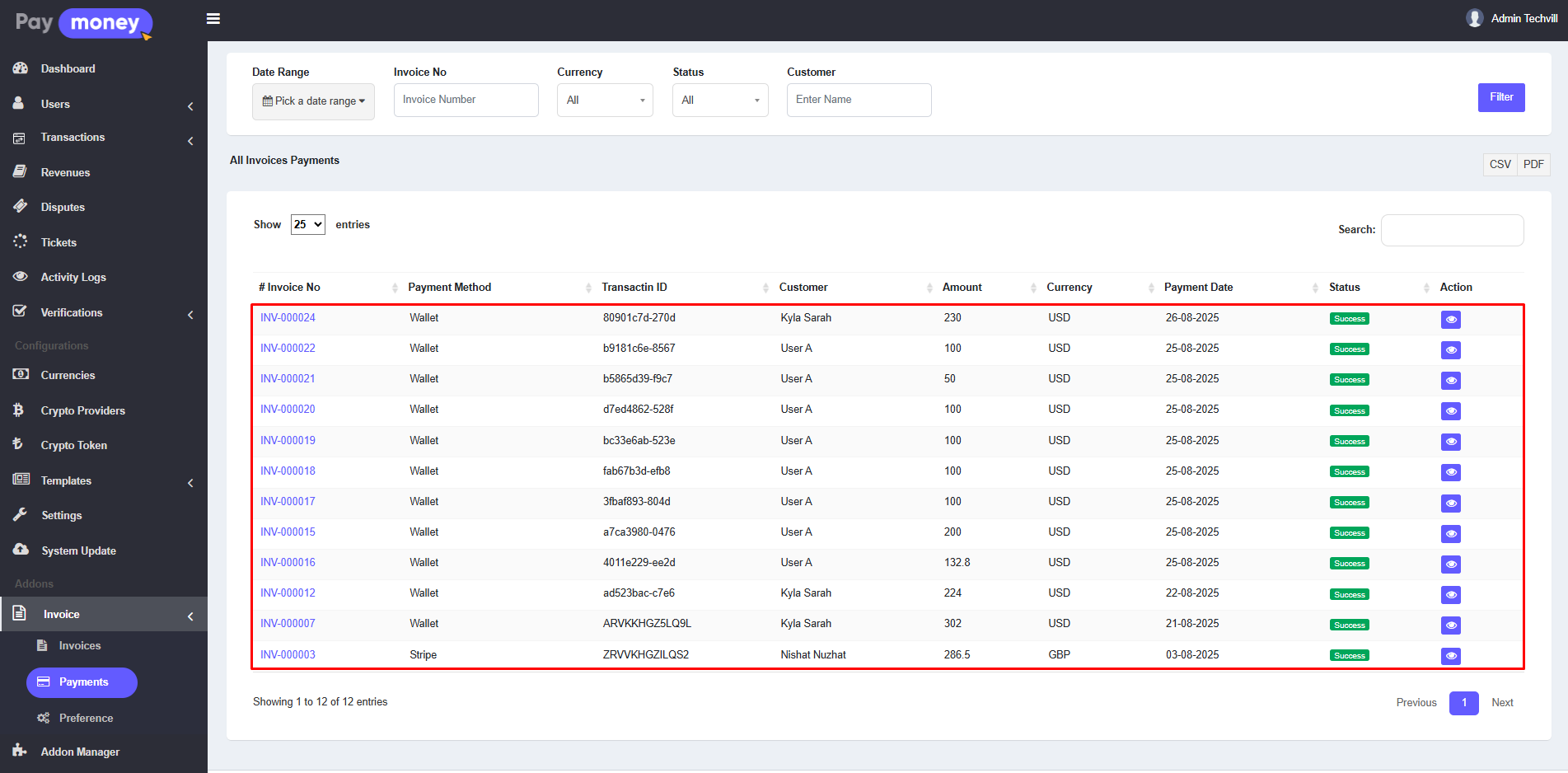 The User Panel provides a complete history of all successful invoice payments, making it easy for users to review past transactions and maintain financial records.