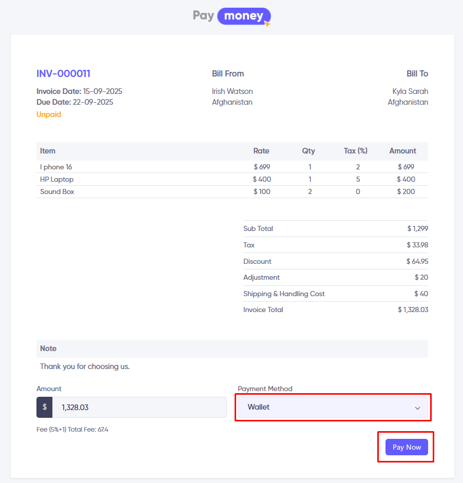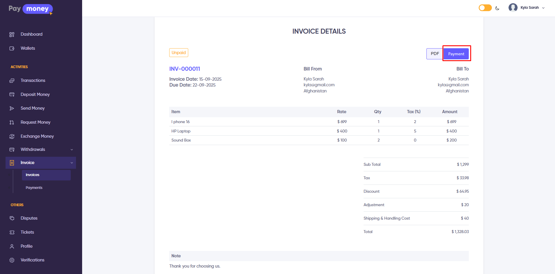 Admins can decide which payment methods are available for paying invoices. By enabling or disabling specific payment options from the Admin Panel, they can control how users complete their payments.