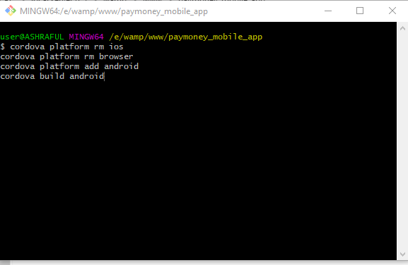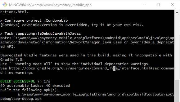 - If all the command successfully run you will see the apk file on \platforms\android\app\build\outputs\apk\debug\app-debug.apk