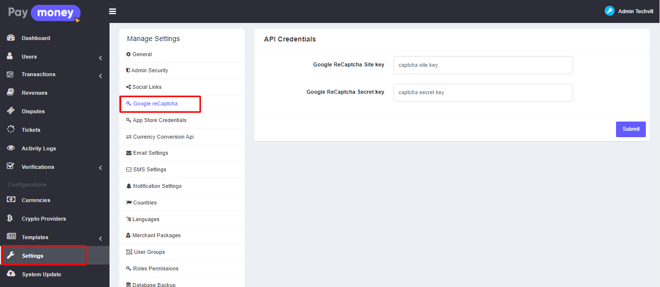 6) Now go to admin -> settings -> Google reCaptcha and Put those keys into the input fields