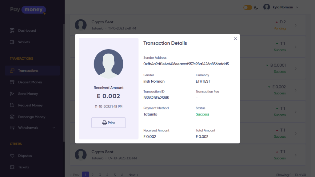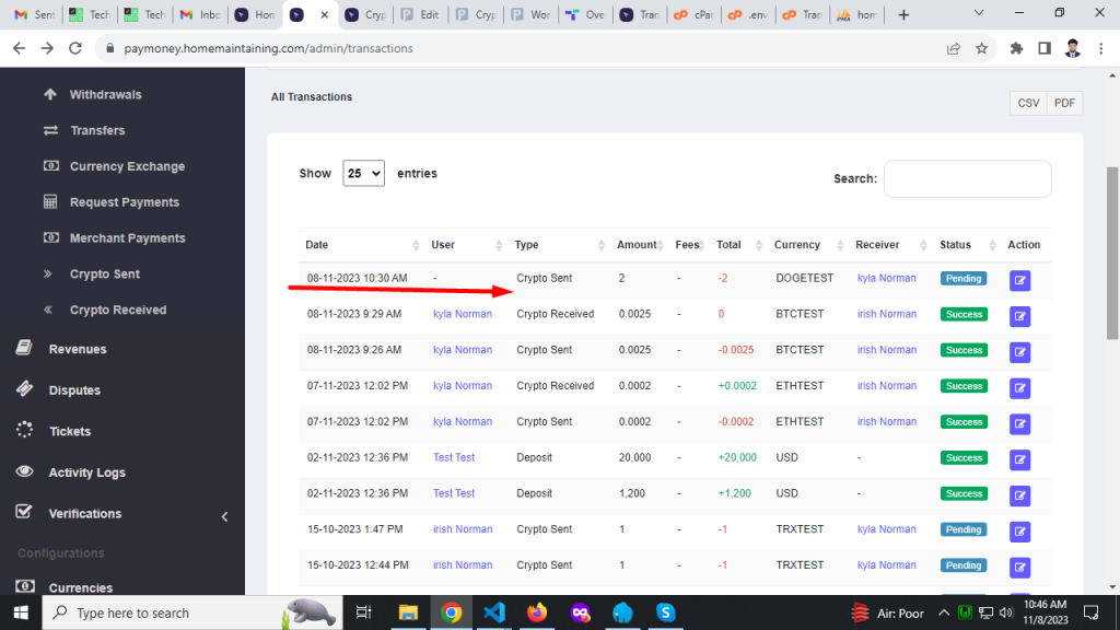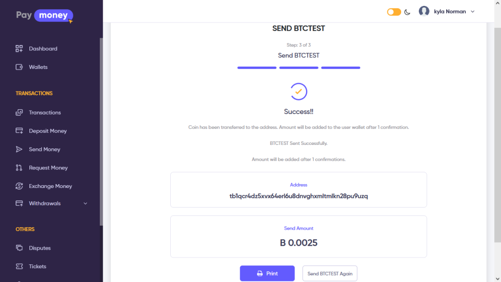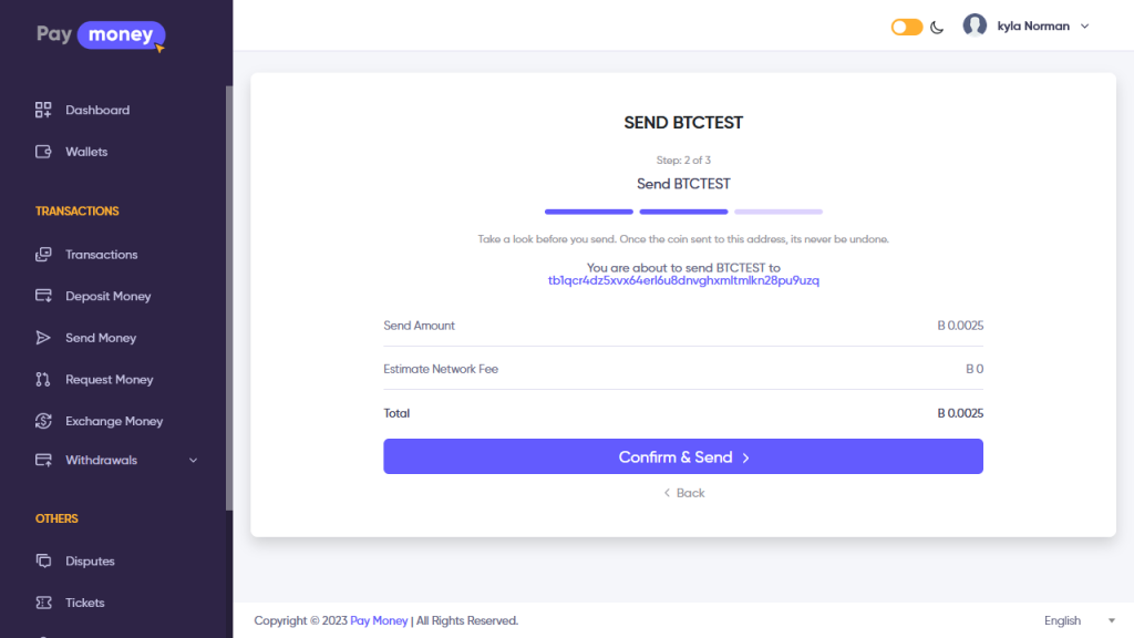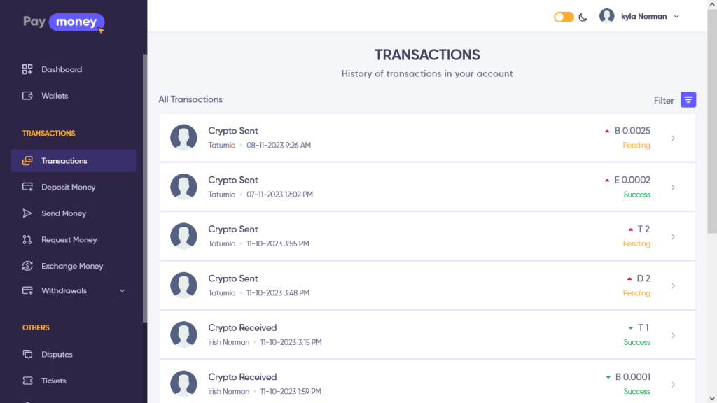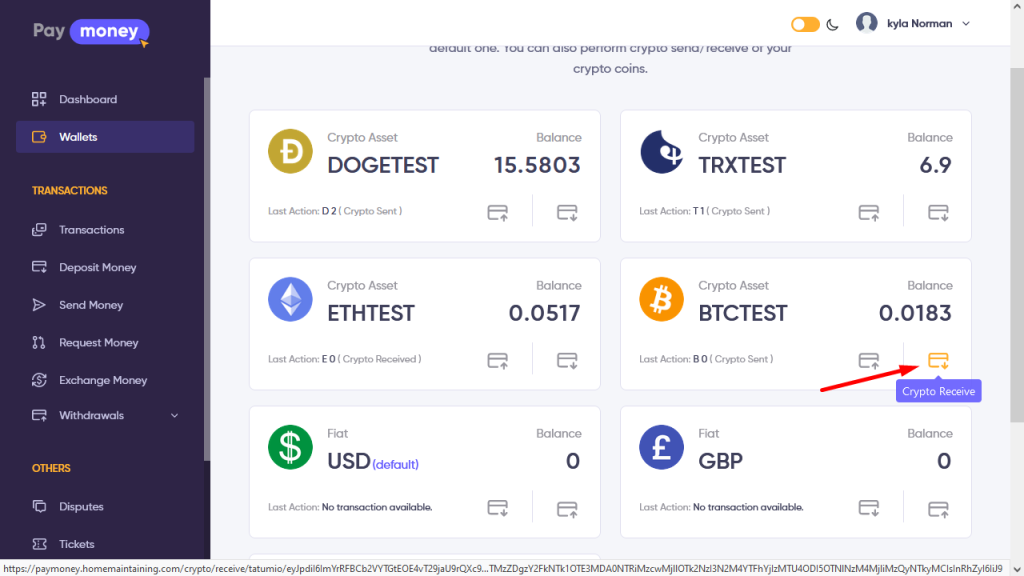 Admin can send Crypto to PayMoney user and also receive from the User.