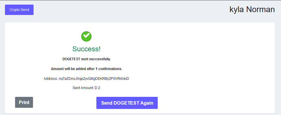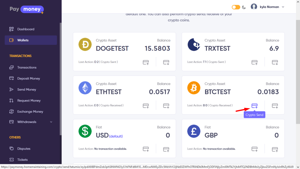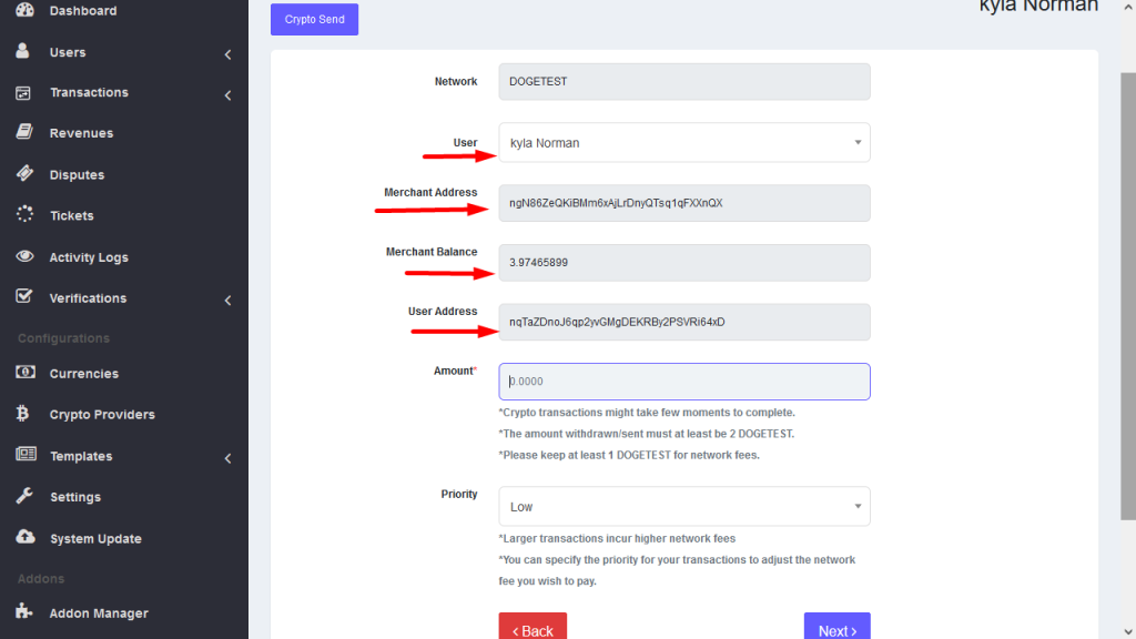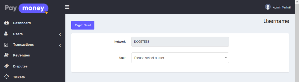 On each crypto asset there is send button, by clicking the button you can initiate the crypto send. On the crypto send page admin first have to select the user to send crypto