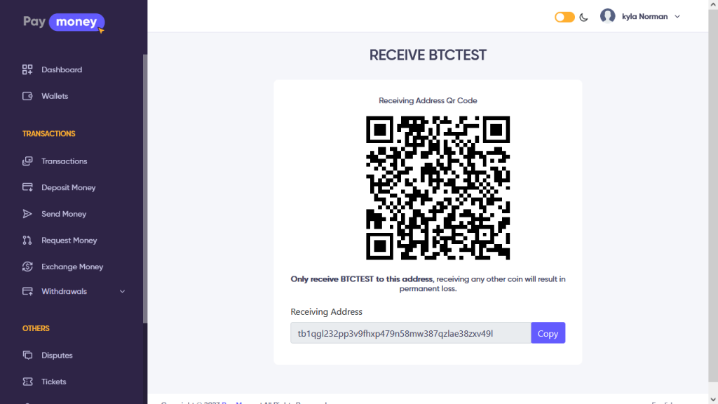 - After a user registers successfully, a wallet address is generated for him/her and he/she can “Send” and “Receive” cryptocurrencies from the user dashboard.