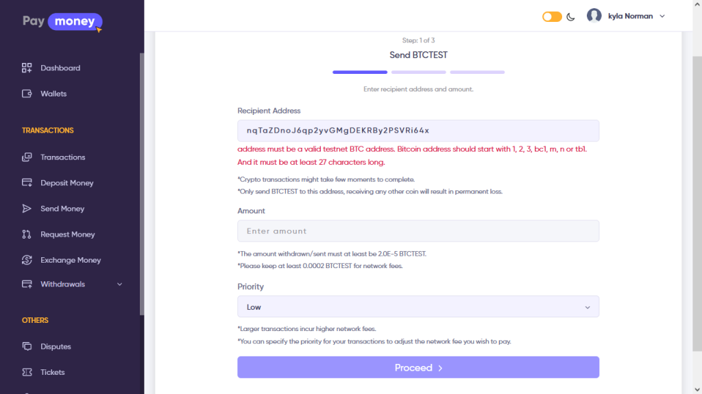 Cryptocurrency can be sent from user to merchant valid network wallet address