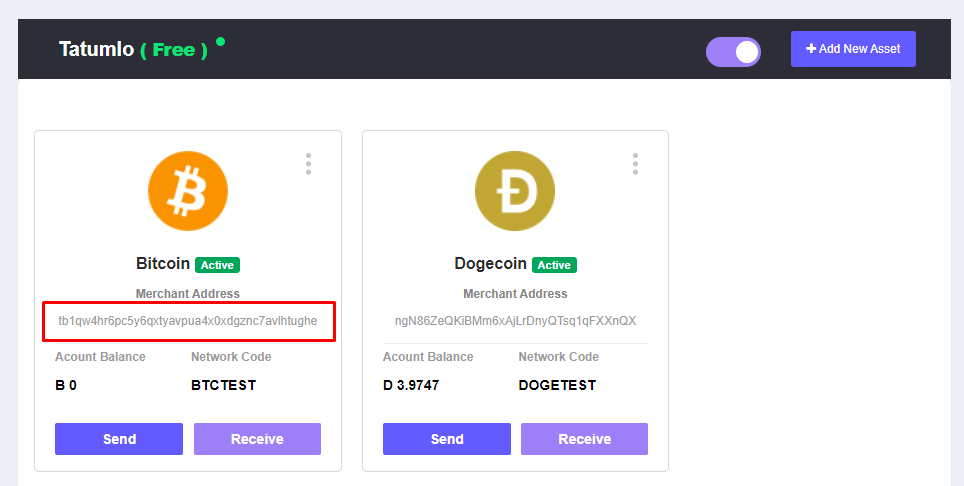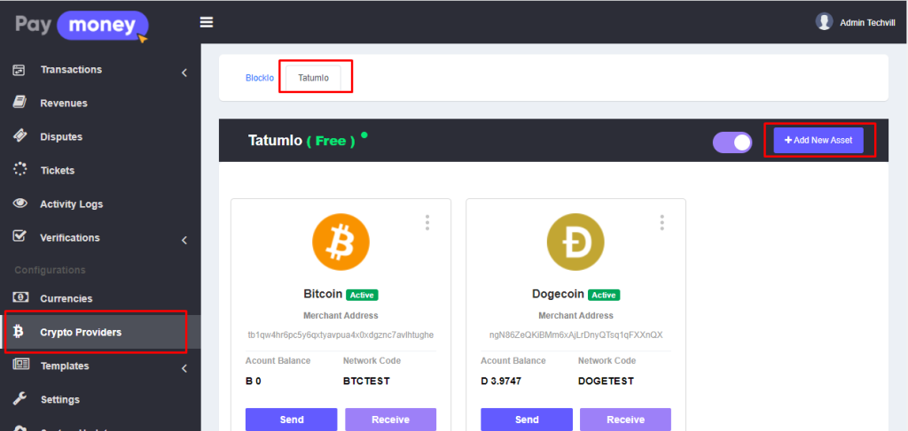 Crypto asset list will be shown on the teatumio provider list, unique address will be generate for the admin this will used as the merchant address.
