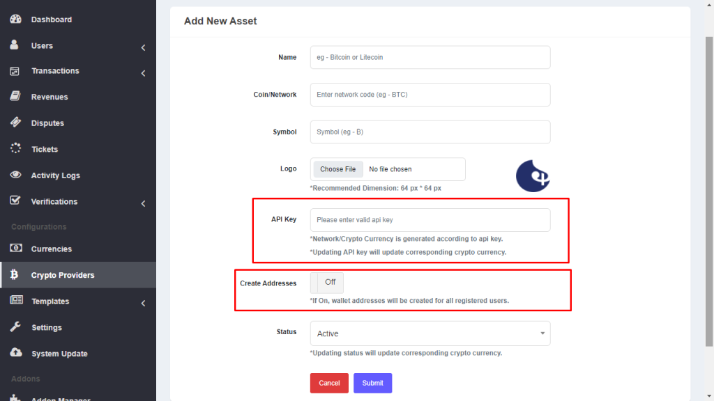 - Go to admin->Crypto Provider ->Tatumio and click “Add new asset” button.