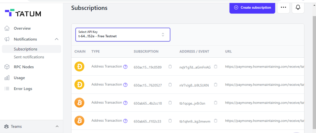 Web hook notification will also create after creating the crypto asset, you can check the notification list on tatum.io dashboards notification panel , by the web hook url crypto transaction notification will be handled on the application.