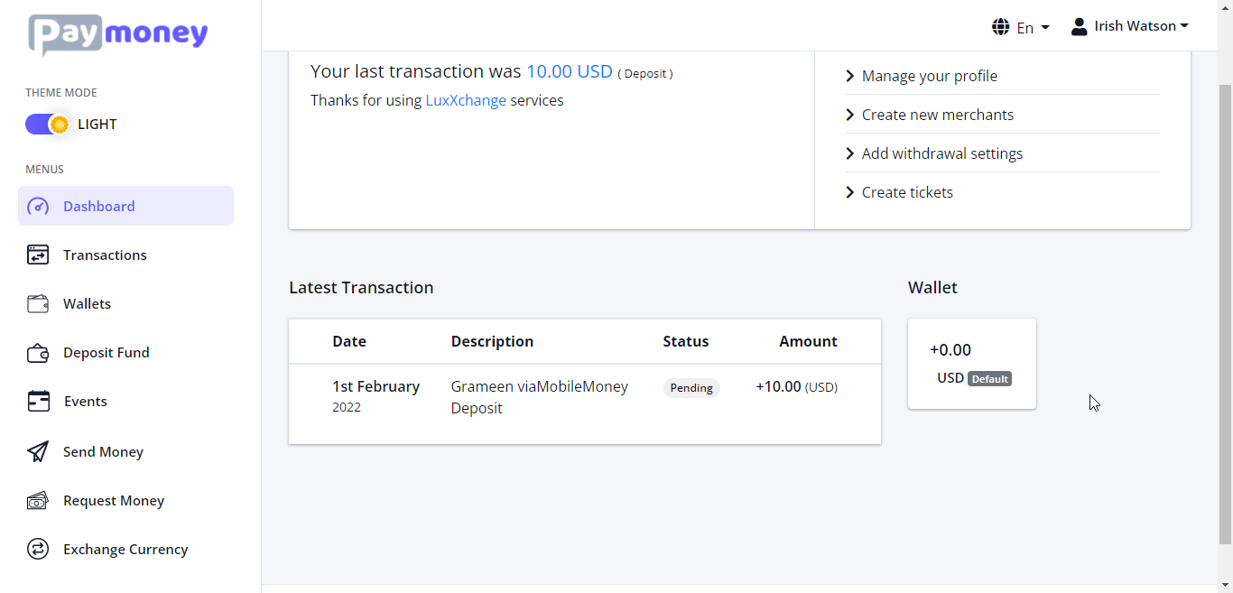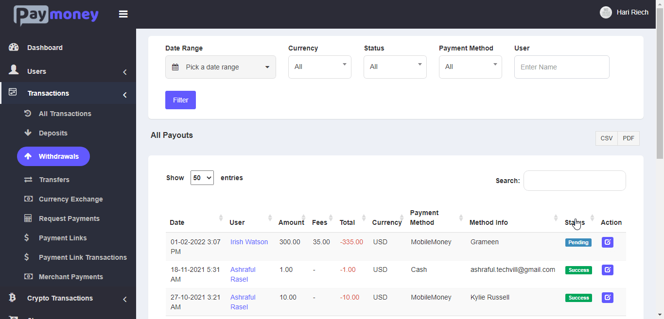 Then admin will send the money to user manually to his his/her mobile number and then make the status of the transaction ‘Success’