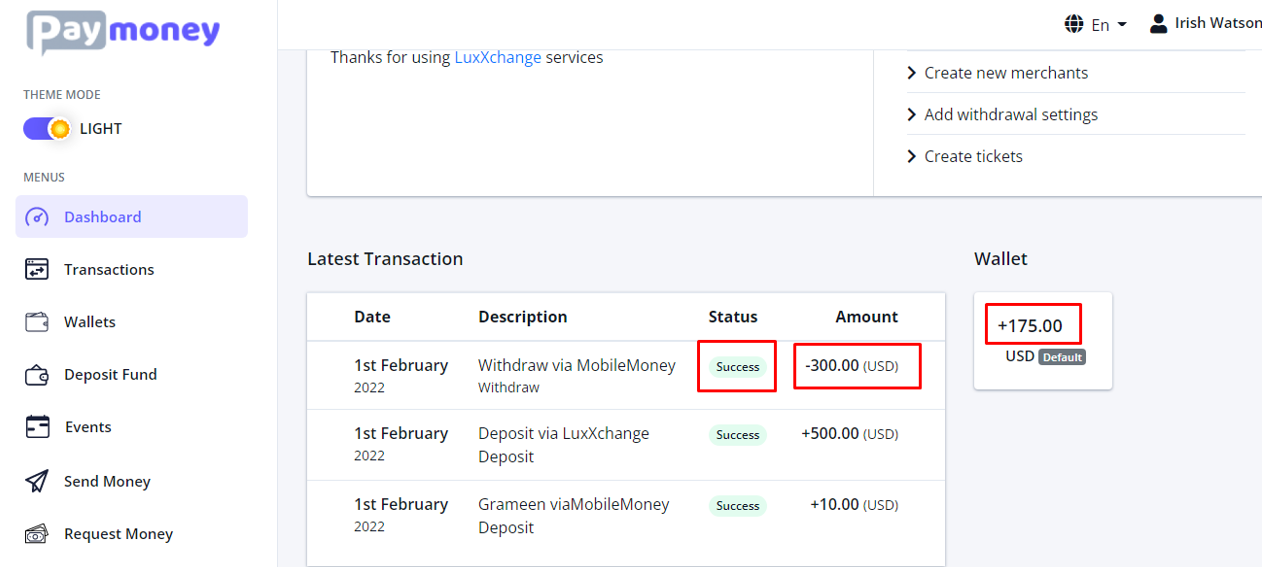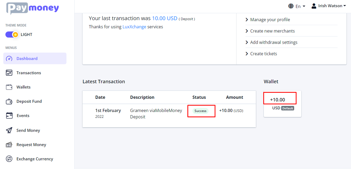Upon completion, you can see a confirmation message as well as the list of MobileMoney.