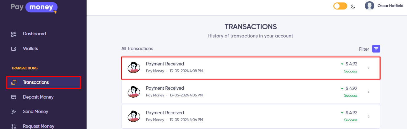 After a successful payment, the transaction details will be accessible in the Transaction Section.
