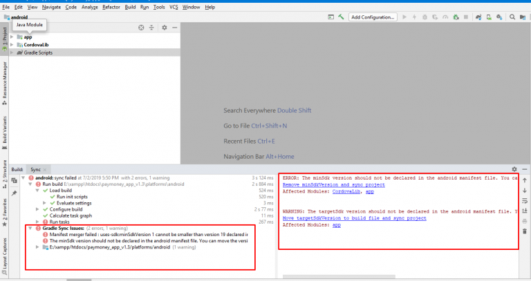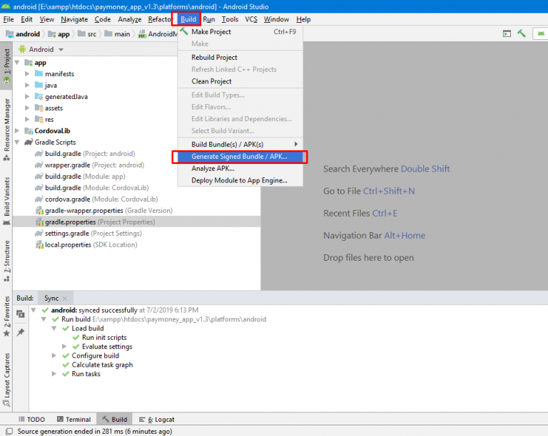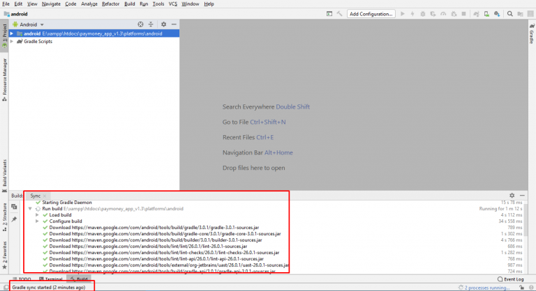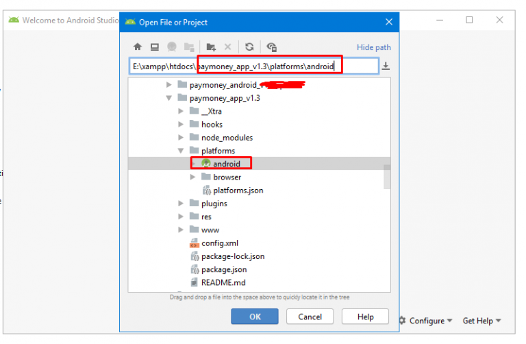 1) Go to the location in your system where PayMoney – Mobile App v1.1 is situated, copy the android platform location (example – E:\xampp\htdocs\paymoney_app_v1.3\platforms\android) and open it on android studio (see below screenshots)