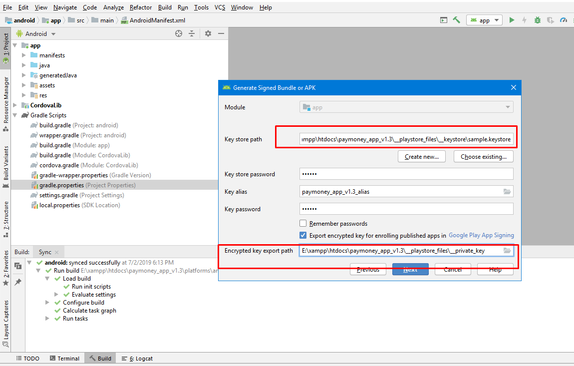 i) key store path: the path where you want to save the .keystore file in your machin. Must have .keystore extension (example- E:\xampp\htdocs\paymoney_app_v1.3__playstore_files__keystore\sample.keystore)
