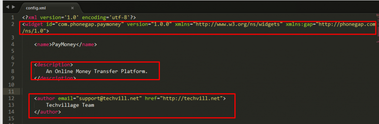 i. Search “widget xml” markup tag and change the id by your app id like id = “com.hostName.appName” and version by your app version like version = “1.0.1”.
