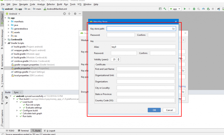 3) Now, a window will open regarding key store (which is needed to sign the app and deploy to play store). Click on “Create new” and fill the following fileds –