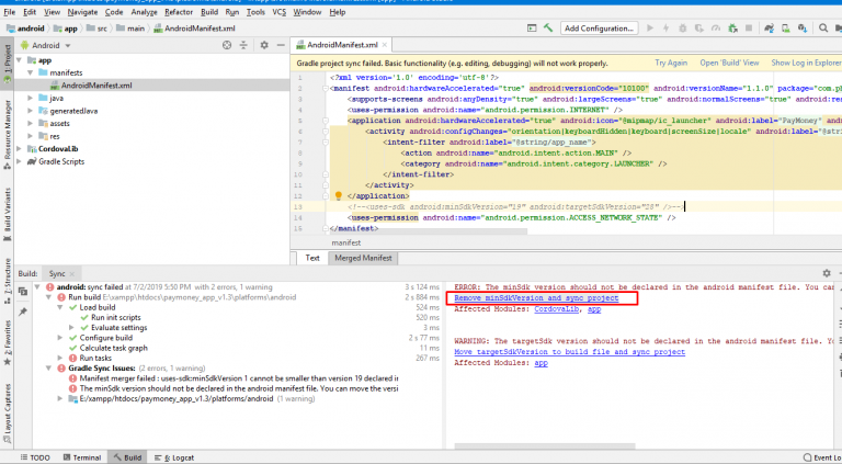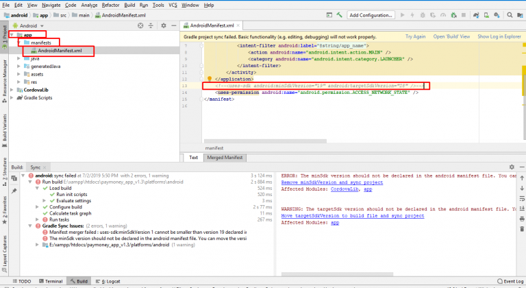 “The minSdk version should not be declared in the android manifest file. You can move the version from the manifest to the defaultConfig in the build.gradle file.”