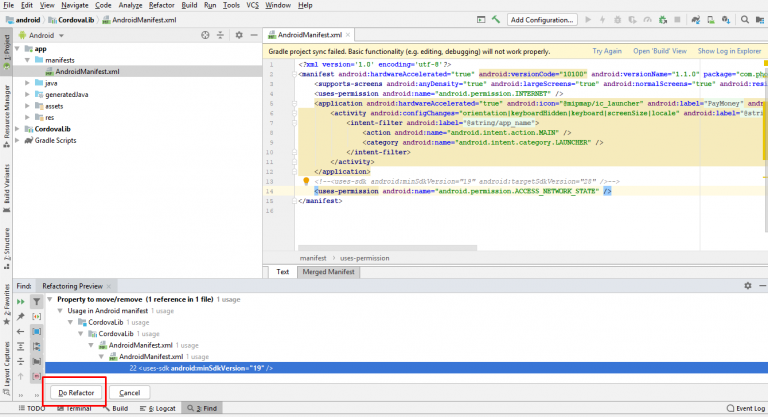 Now, click “move minSdkVersion to build files and sync project” and then click “Do Refractor” (see below screenshots)