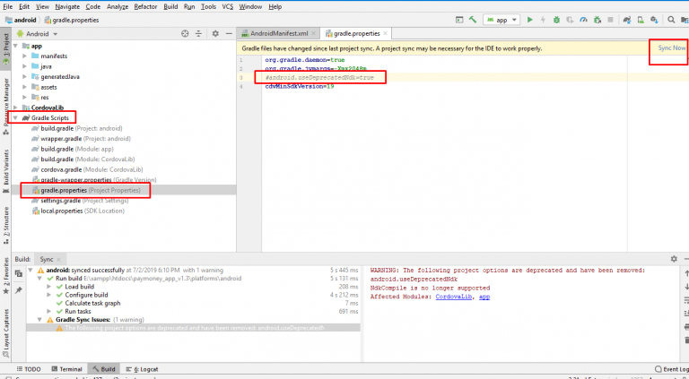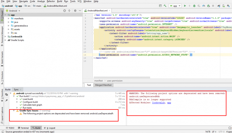 Gradle will sync again and might throw a deprecated NdkCompile warning (see below screenshot)