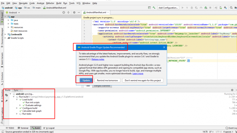 You might see a pop-up window of “Android Gradle Plugin Update Recommended” and click on Update (see below screenshot).