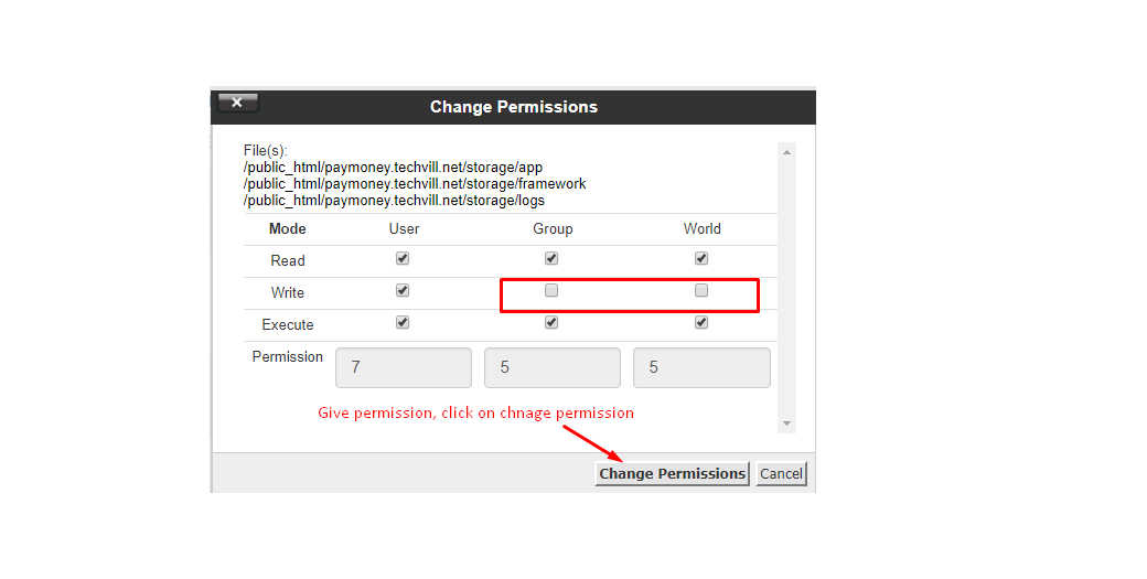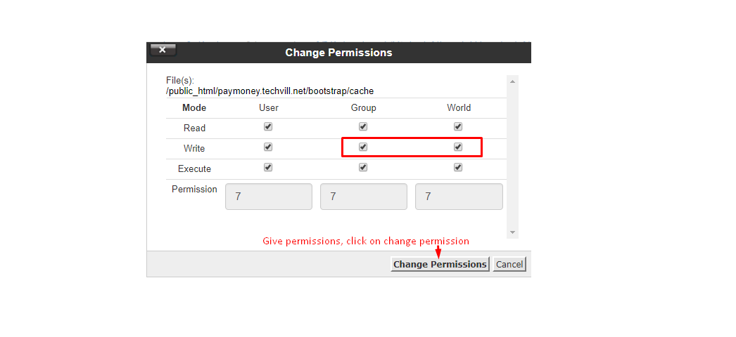 5) Go to bootstrap/cache and give write permissions (as mentioned in step-4).