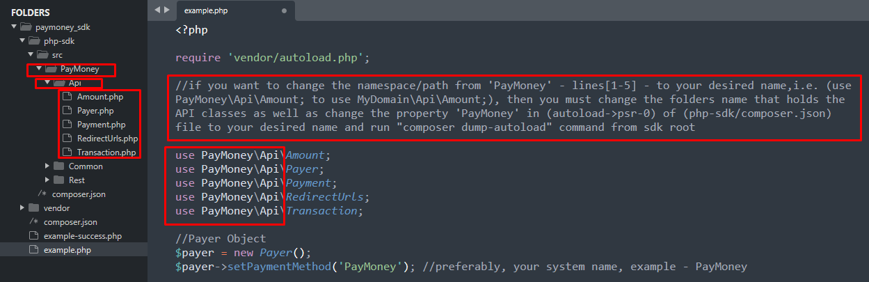 If you want to change the namespace/path from ‘PayMoney’ in example.php after downloading the paymoney sdk to your desired name, i.e. (use PayMoney\Api\Amount; to use MyDomain\Api\Amount;), then