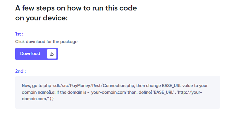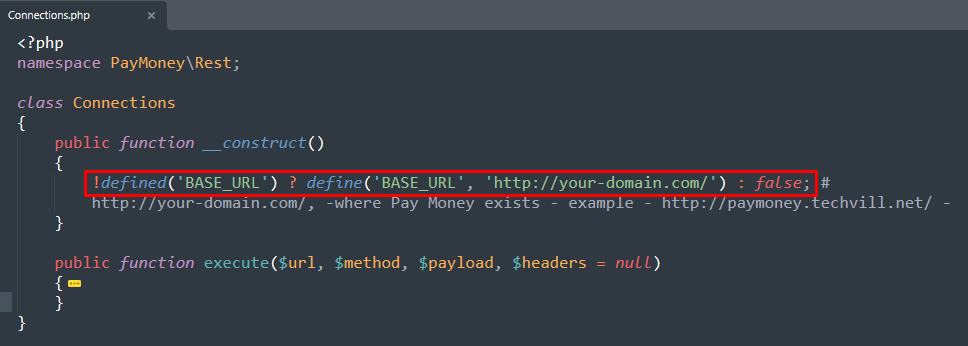 b) Go to php-sdk/src/PayMoney/Rest/Connection.php, then change BASE_URL value to your domain name.