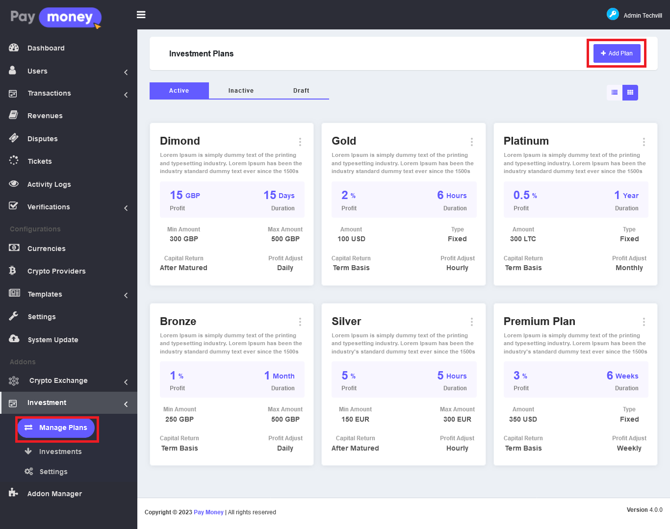 Add investment plan from admin panel