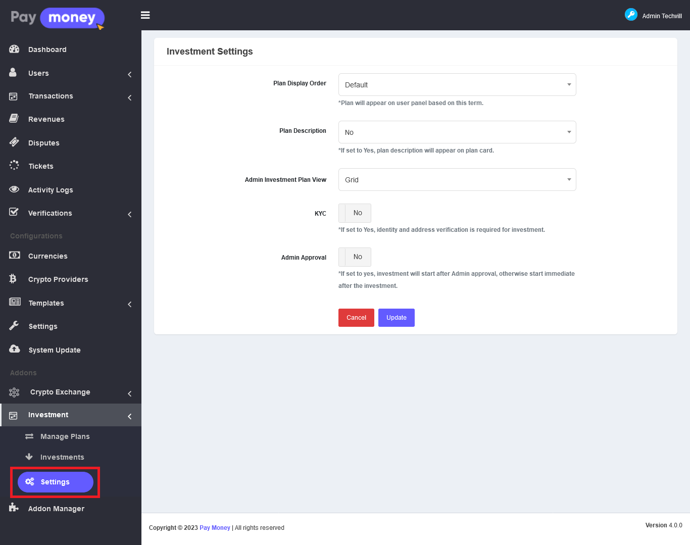 Admin can select multiple payment methods by which users can make payments for their investment.