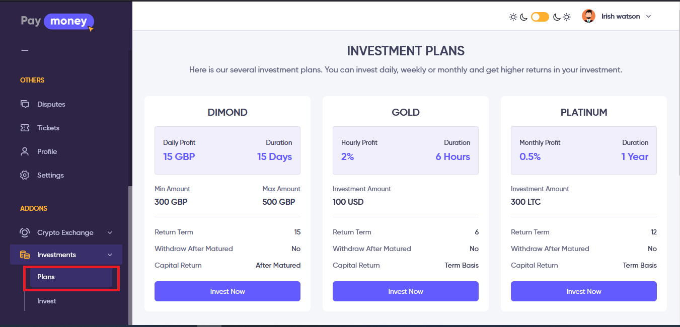 User can see all active investment plans from the user panel to choose which plan he/she wants to invest in. By clicking on invest button they can go directly to invest page with a chosen investment plan.