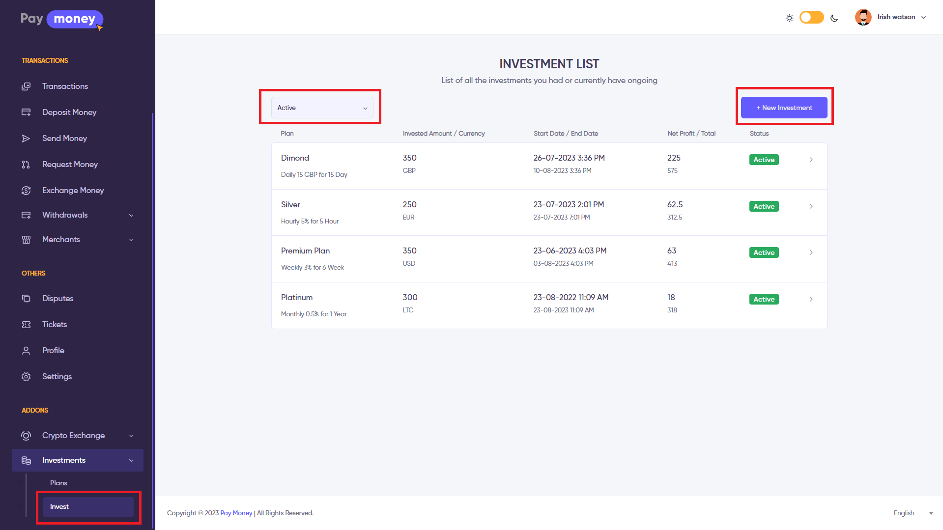 If the user press continue button and selected the payment method wallet then the investment will be complete with the status ‘Active’ or ‘Pending’ depending on how the admin set the investment setting field invest starts on admin approval. If it is set to ‘Yes’, then investment will be completed with ‘Pending’ status, if not then it will be completed with ‘Active’ status.