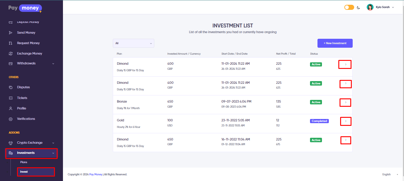 Logged-in users will have a menu called” Investment”, from this menu they can view all their investments. By selecting ‘Active’, ‘Pending’, ‘Cancelled’, and ‘Complete’ from the dropdown, they can see which investment is in which status, and by clicking Invest they can make a new investment.