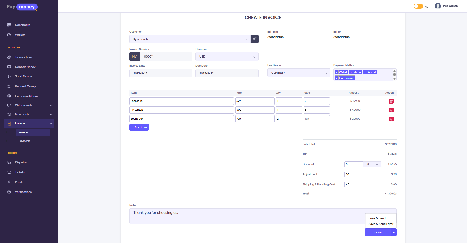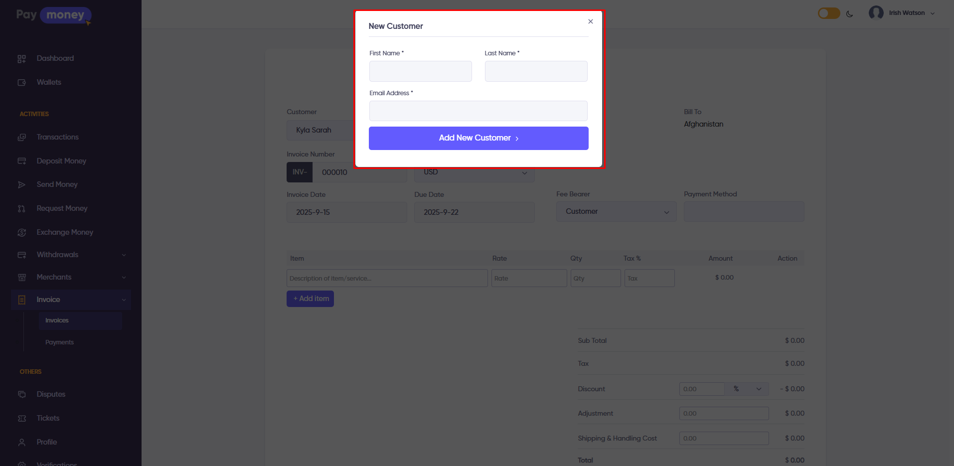 - Enter invoice details, including amount, description, due date, and any optional fields such as discounts , Adjustment or taxes.