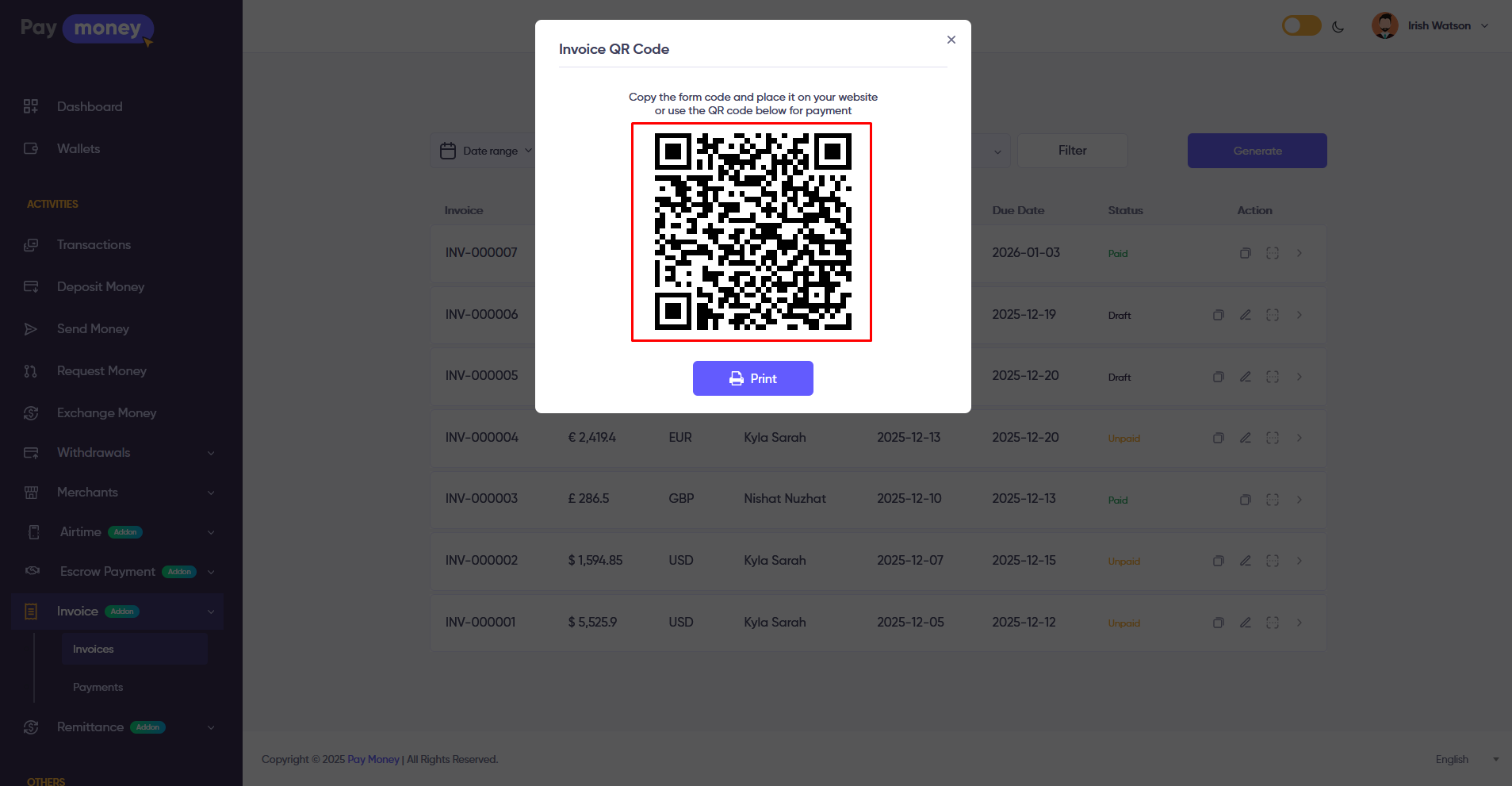 - QR Code – Each invoice generates a unique QR code, allowing register or unregistered users to make payments easily.