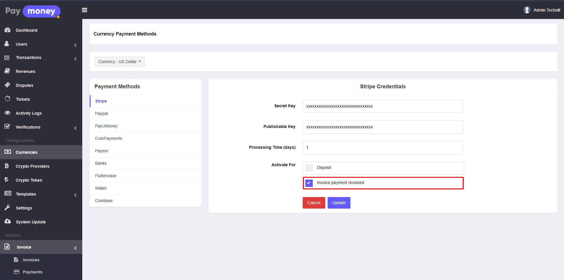 - Currently, PayMoney invoice supports: PayMoney Wallet, Stripe, PayPal, PayUmoney, Payeer, Coinpayments, Coinbase and Flutterwave.