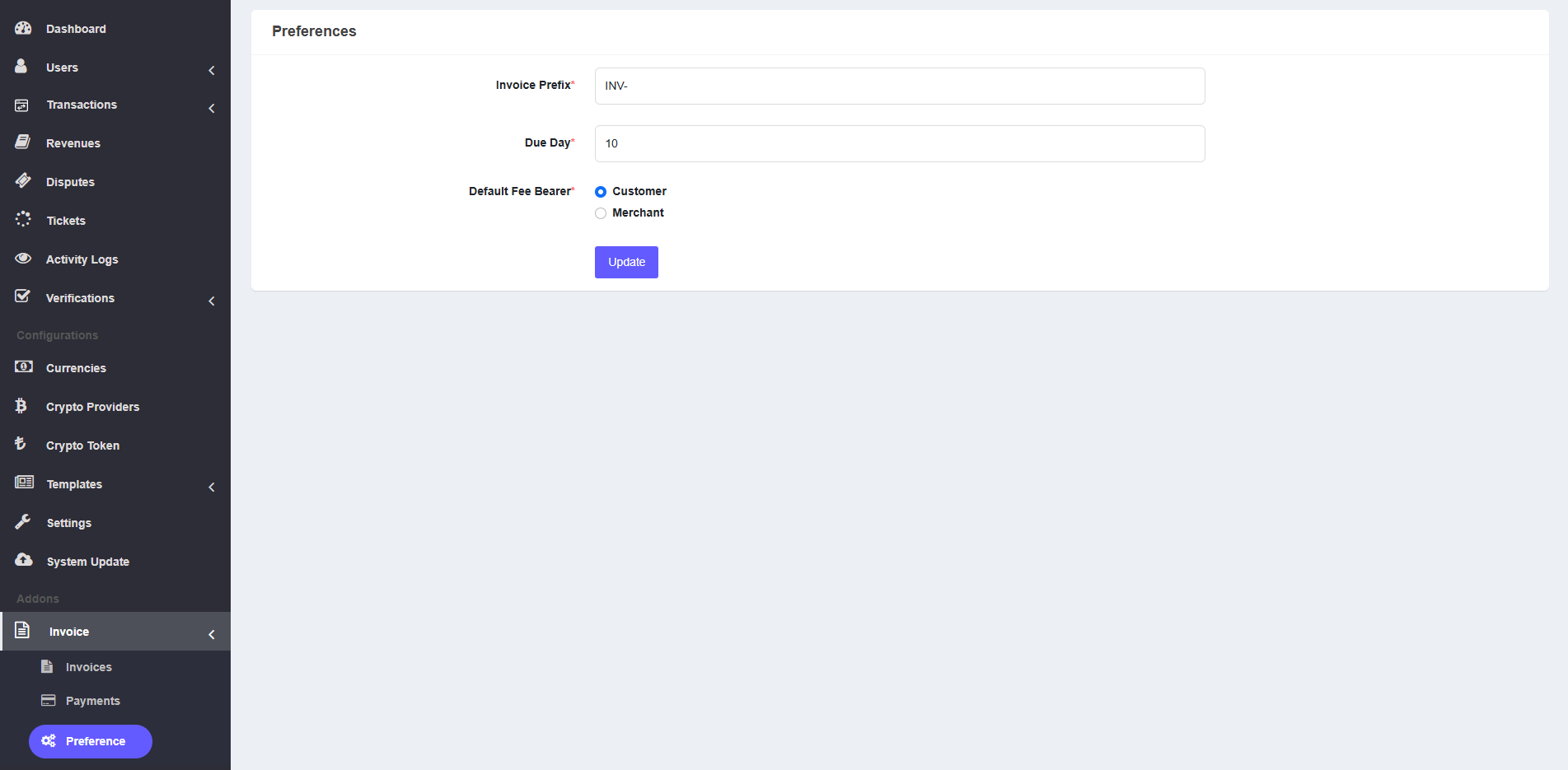 Admins can manage default invoice behavior through the Invoice > Preference settings: