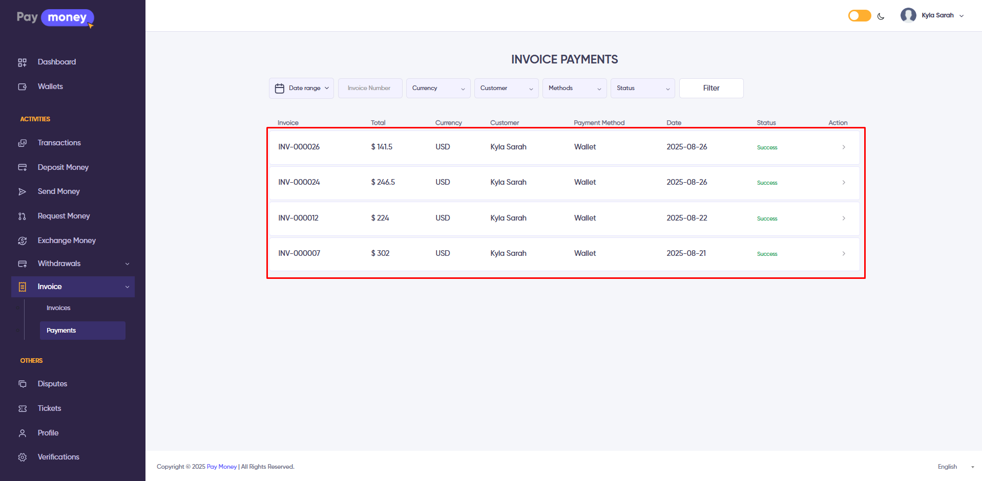 The User Panel provides a complete history of all successful invoice payments, making it easy for users to review past transactions and maintain financial records.