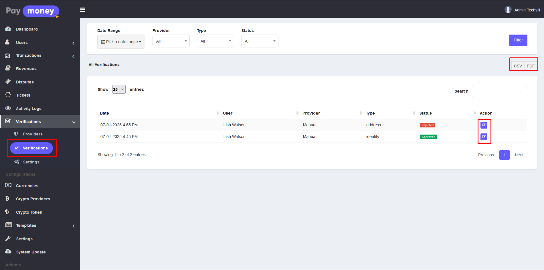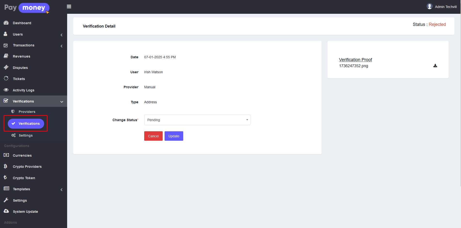 Admin can update the verification status from the verification edit feature. To update the verification status, please click on the edit button and the admin will be redirected to the verification edit page.