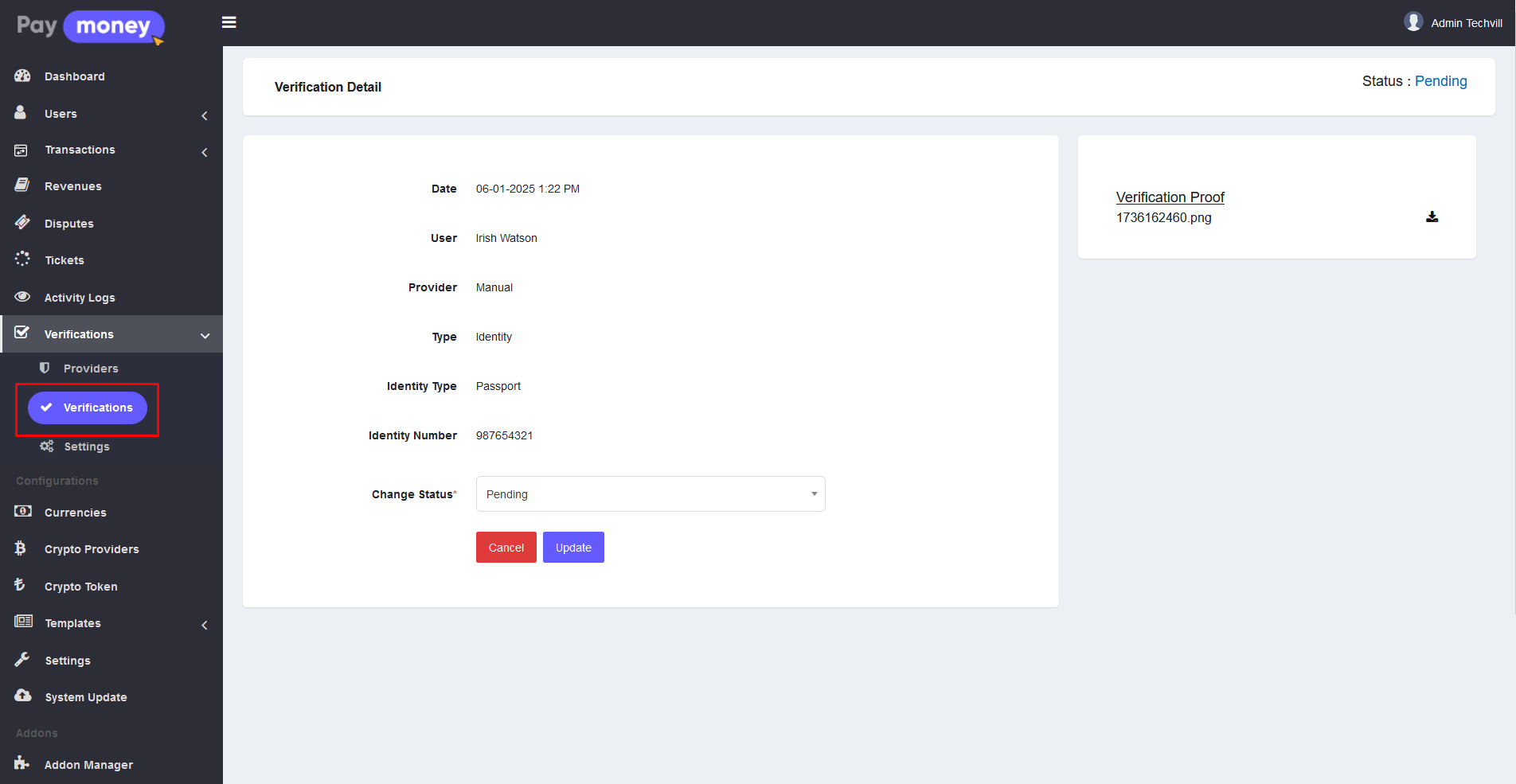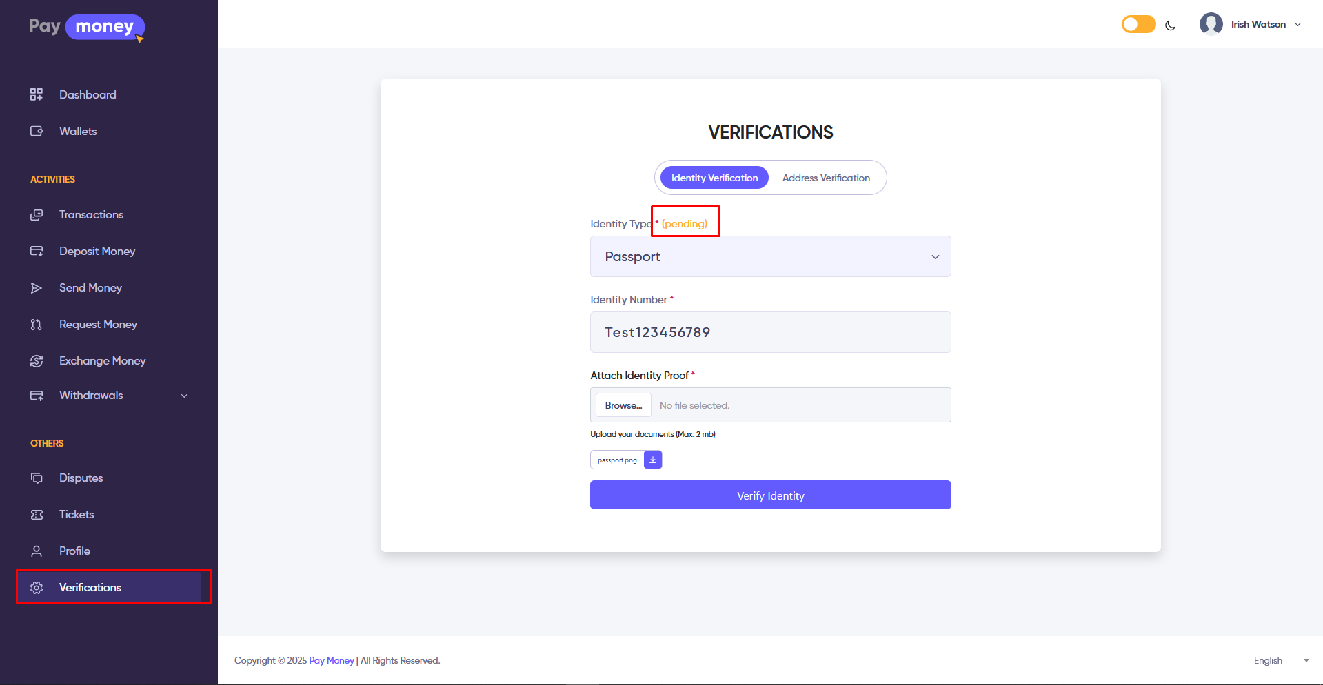 Once the user submits the proof, the initial status will be set to "Pending". After the admin reviews the documentation, they will either approve or reject the identity verification. The updated status will be displayed next to the Identity Type label.