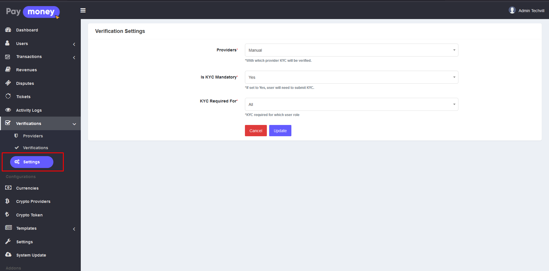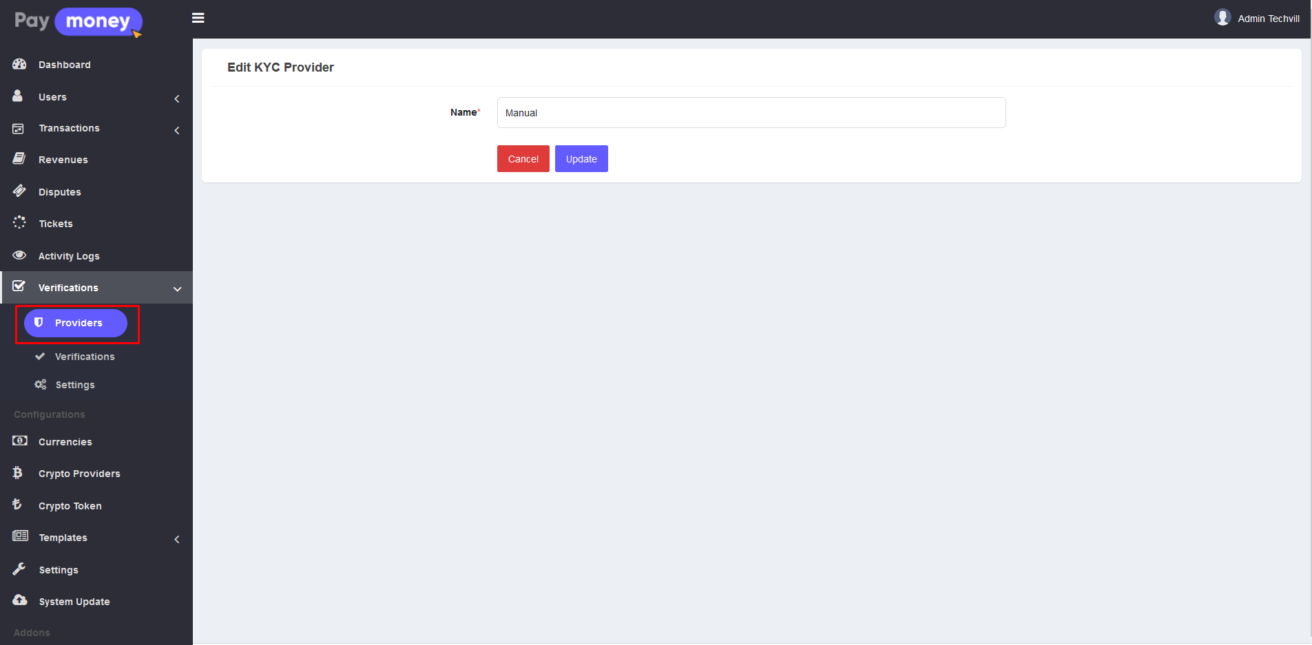 Providers: This field specifies the active provider for the verification process. By default, manual verification will be enabled. Additionally, the system supports custom on-demand KYC verification modules, such as Veriff and AmlBot. If the admin installs these modules in the PayMoney system, they will appear in the provider's list, allowing the admin to select their preferred provider for KYC verification.