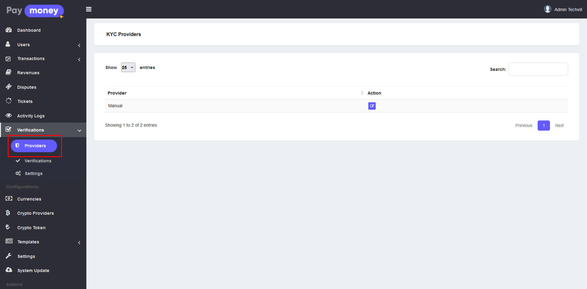 Verification Providers: Admin can view currently available providers from this feature. To view currently available providers admin needs to visit this menu Verifications > Providers