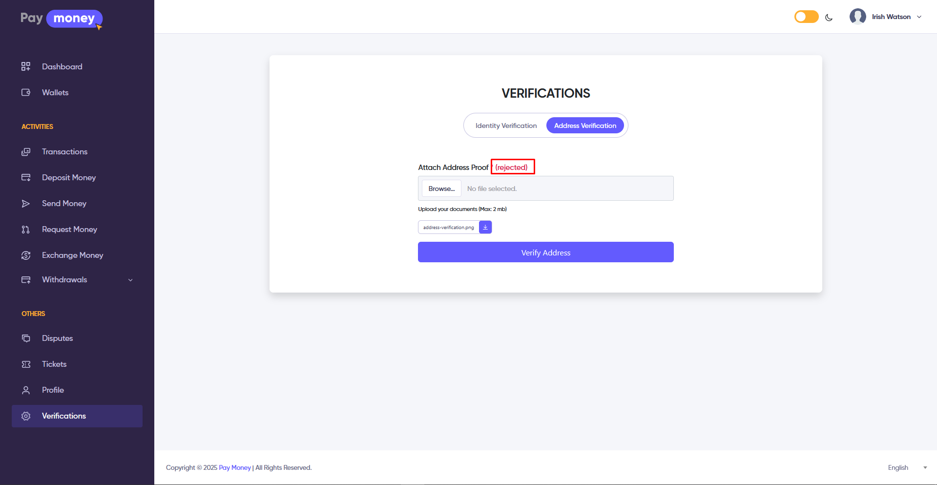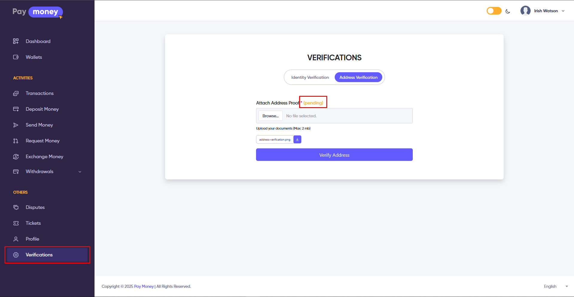 Once the user submits the proof, the initial status will be set to "Pending". After the admin reviews the documentation, they will either approve or reject the address verification. The updated status will be displayed next to the Attach Address Proof label.