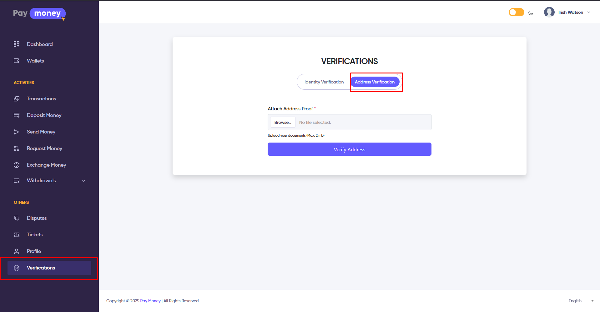 Address Verification: To request identity verification, navigate to the Verification section. By default, you'll be in the Identity Verification tab, click on the Address Verification tab.