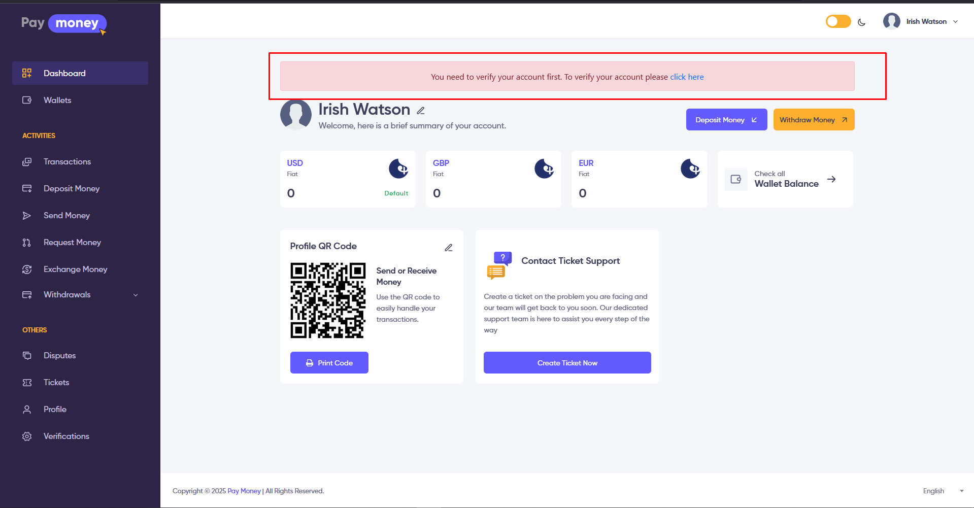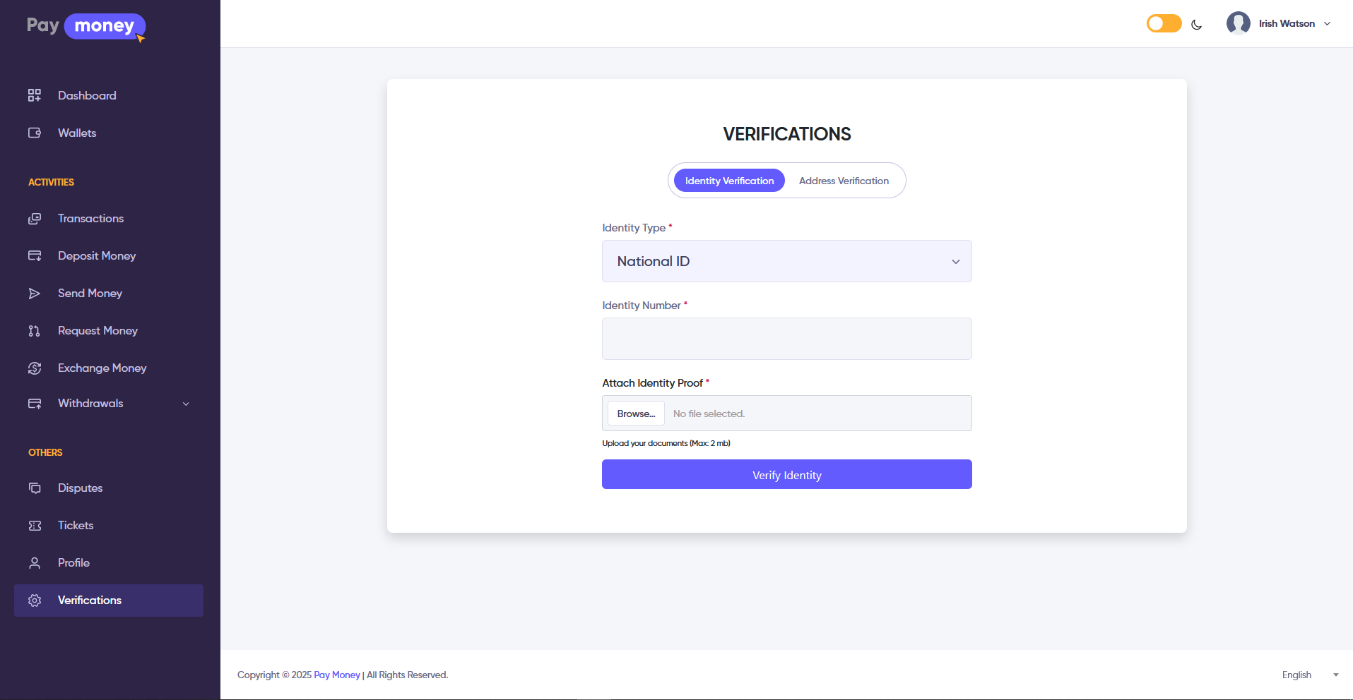 Dashboard Notification: If KYC verification is required, the user will see a notification on their dashboard in the user panel, prompting them to complete KYC verification. The system includes both Identity and Address verification, and the user must verify both. If either verification is incomplete, the user will be restricted from performing any transactions, and the notification will remain visible on the dashboard.