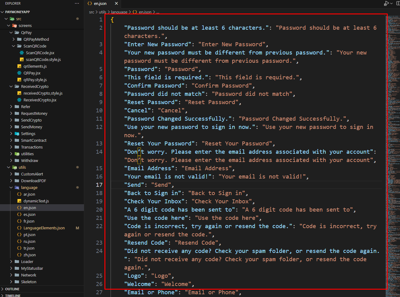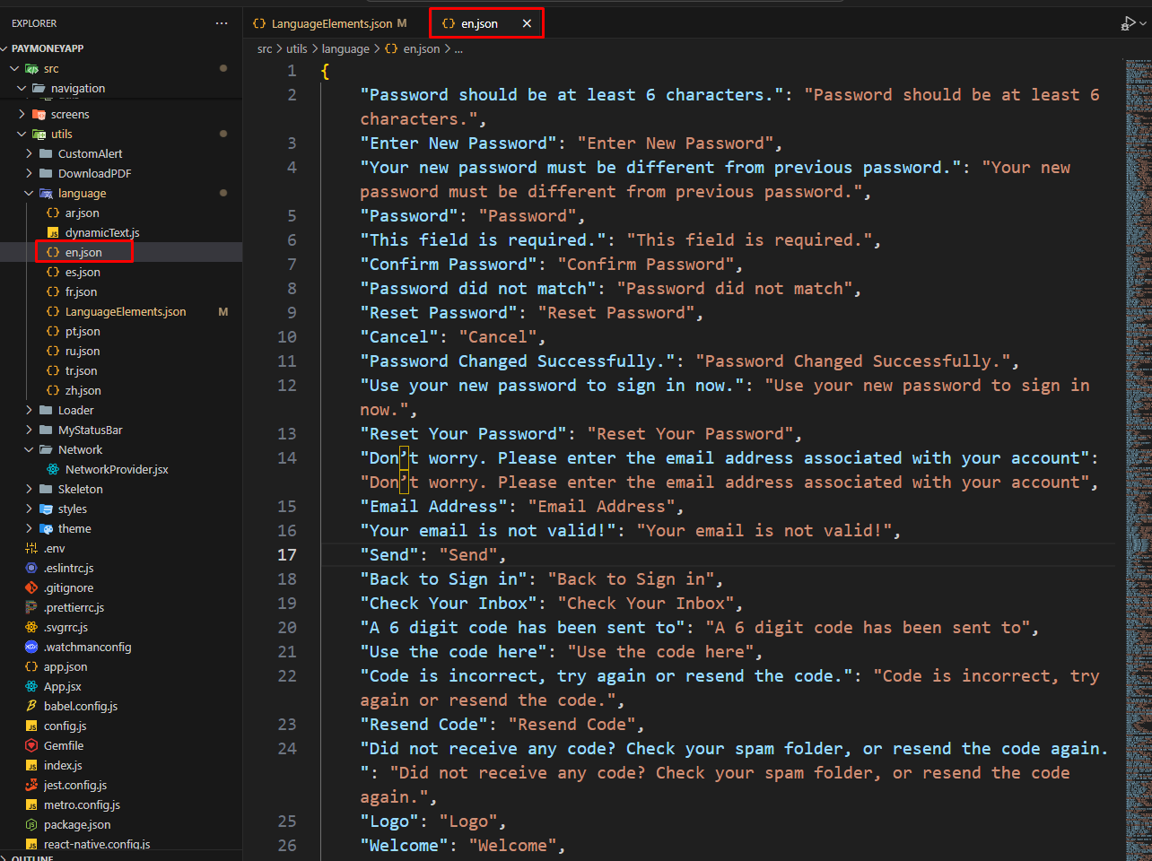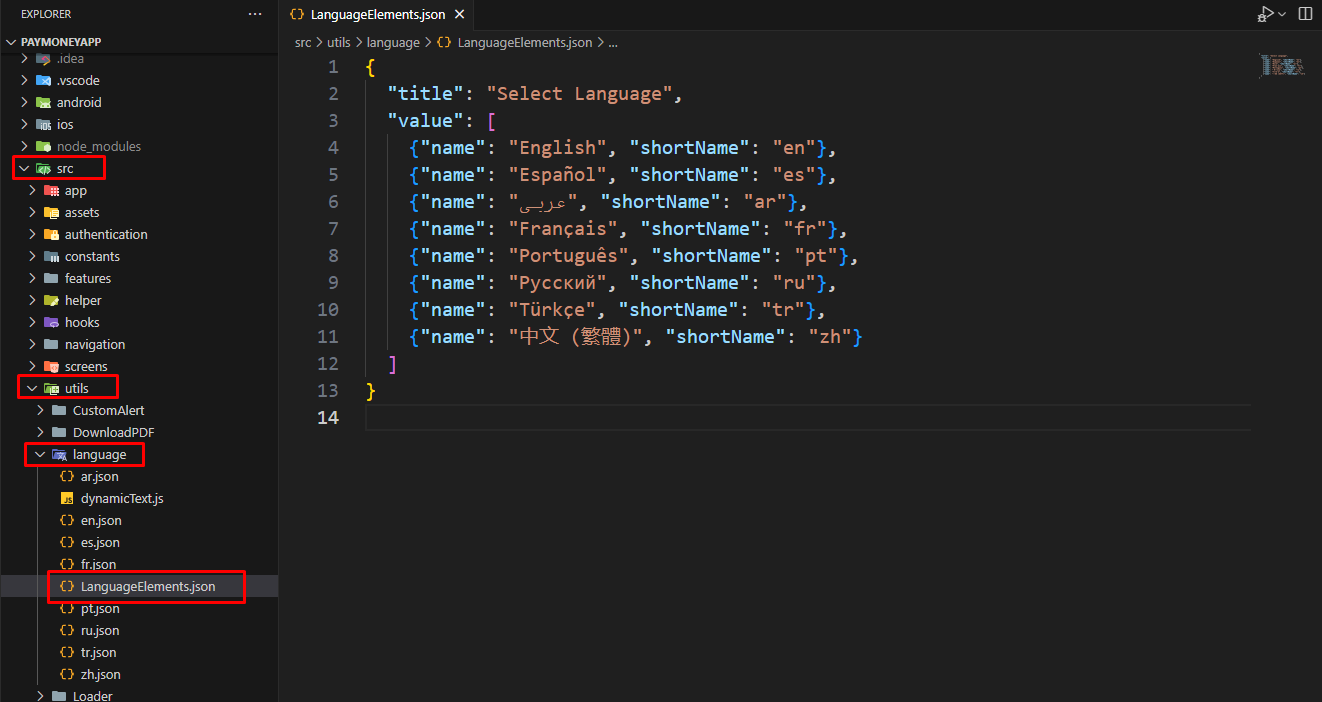 { name: English, shortName: ‘en’}, then the json file should be en.json (following shortName ‘en’) which contains all the text as a key value pair.