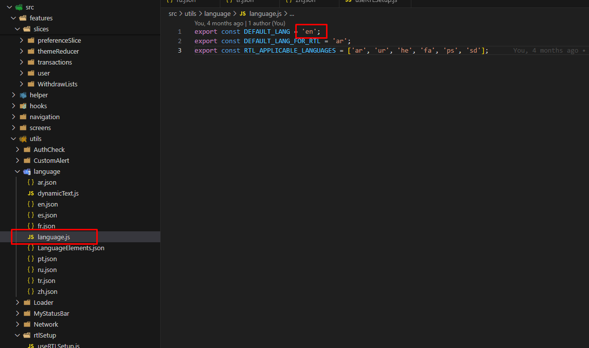 - When adding any RTL (Right-to-Left) language, if its short code is not already included in the RTL_APPLICABLE_LANGUAGES list (shown below), make sure to add the short code to ensure proper layout direction across the app.