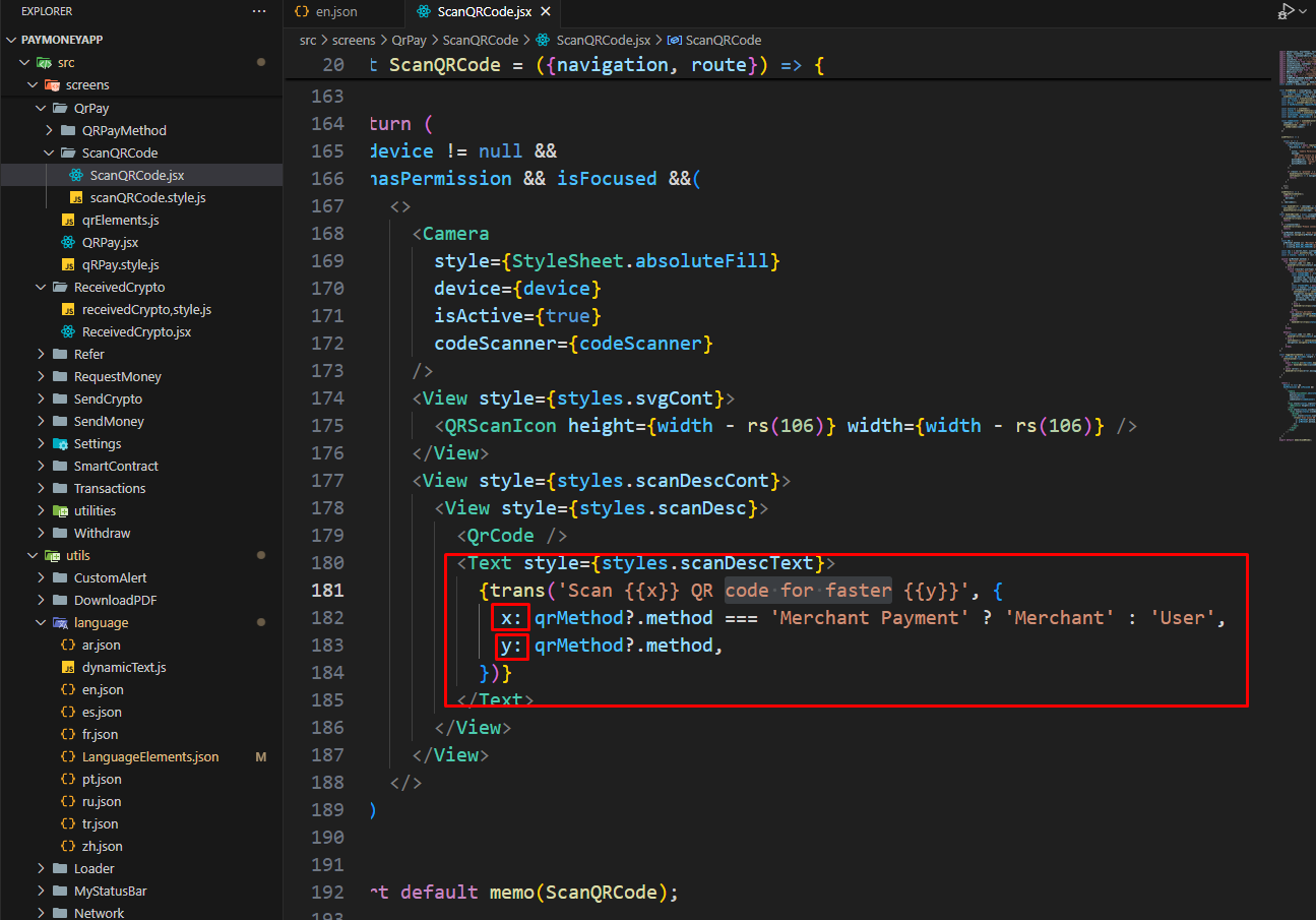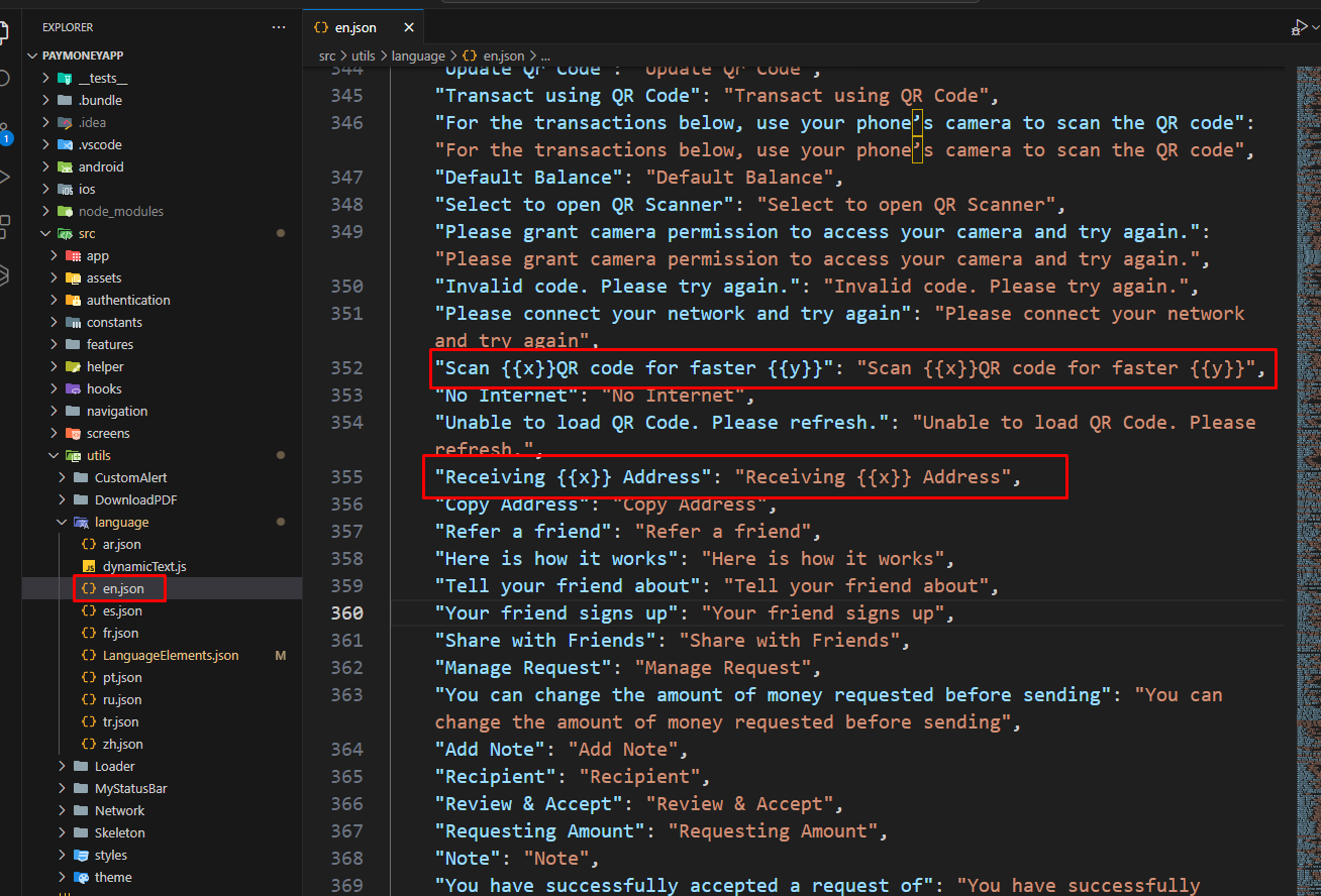 For the dynamic text which we get normally after fetch api endpoints there could be a mix of static and dynamic variable which represents a sentence. For that case the representation of the sentence is different compared to static text in the language json file as follows: