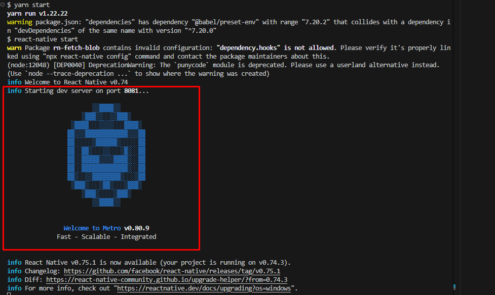 - yarn start (Which will run the metro bundler. Please wait for few seconds until the metro bundler run)