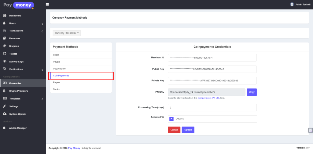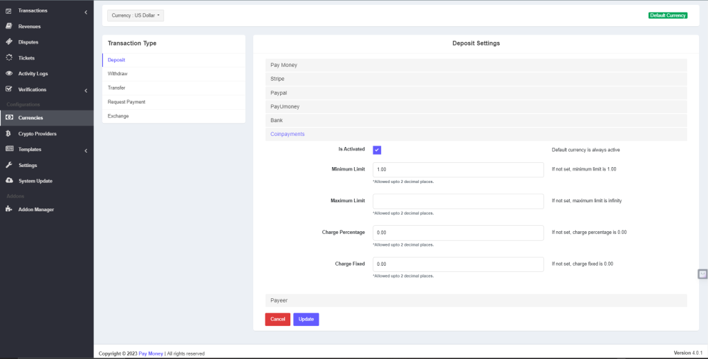- Activate CoinPayments and set minimum/maximum limits and transaction fees.